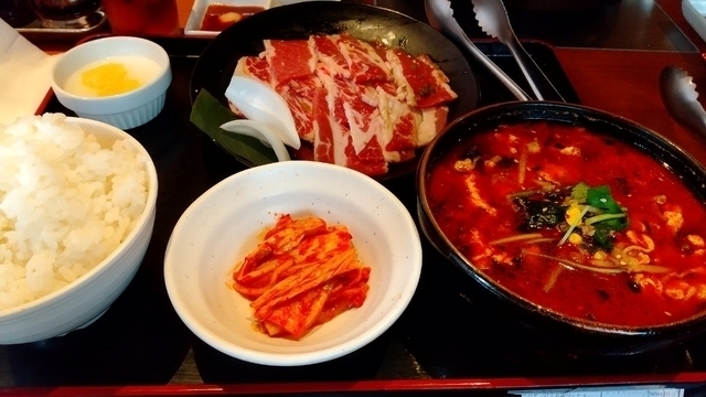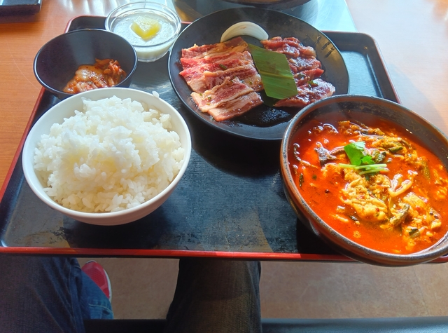 GOTOイートのポイントが今月で使用期限が切れてしまうので予約しての利用です。 14時だったので空いてました。 17時までやってるランチのカルビとユッケジャンスープのセットを頼みました。 いつもは中落ちカルビなんですが、カルビも美味しかったです。 炭火で肉質も悪くないので満足です、ユッケジャンスープも具沢山で美味しいです。