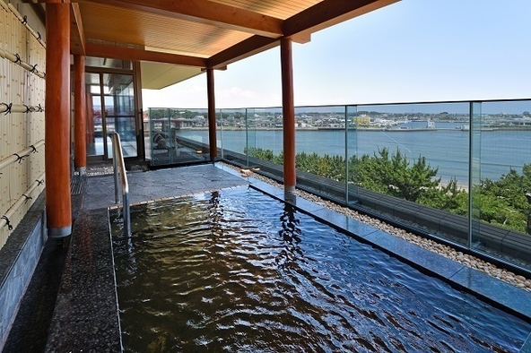 大事浴場には檜を使用した【松の湯】と石造りの【磯の湯】がございます。 またそれぞれに、露天風呂(檜/石)とサウナを設置しております。 大洗温泉につかりながら、四季折々の空と海の表情を楽しみ、旅の疲れを癒してください。 泉質…ナトリウム塩化物冷鉱泉 効能…神経痛・筋肉痛・関節痛・慢性皮膚病など 〈写真/露天風呂(石)〉