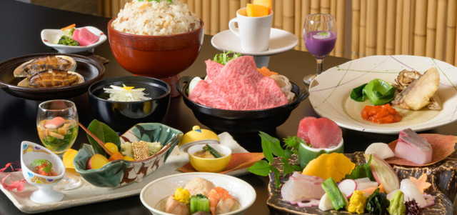 写真はプレミアム会席/メインディッシュをブランド牛、又はあわびからお選び頂けます。
