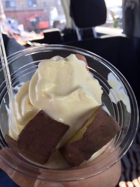 焼き芋がのったボリュームソフトクリーム頂きました。ひんやりソフトクリームに熱々のお芋が絶妙。ソフトクリームも濃厚でお芋もおいしいお芋でした。