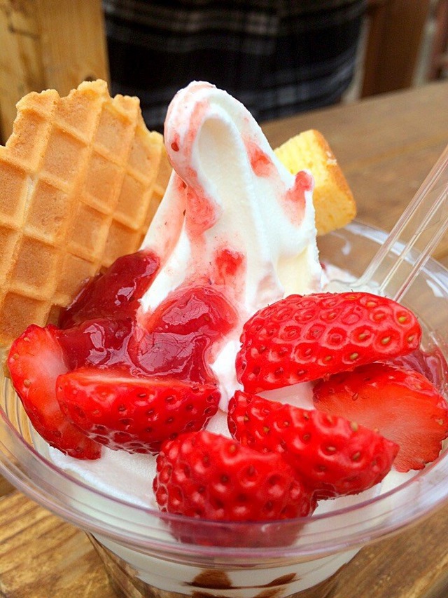 イチゴがりをしました。イチゴがとても大きくて美味しかったです。 ソフトクリームも食べました。私はイチゴとバニラが入ってるソフトクリームを食べました。 とても美味しかったです。( ^∀^)( ^∀^)