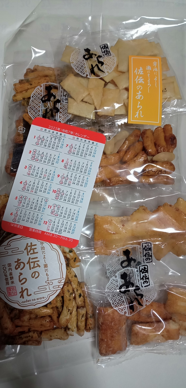「あられ詰め合わせ」「松葉」を購入しました。カレンダーと小袋のあられをサービスに頂きました。ここのあられは、とっても美味しいので、手が止まらなくなります。小袋では物足りなく、大袋だと、余裕で1袋食べてしまいます。オススメです!!