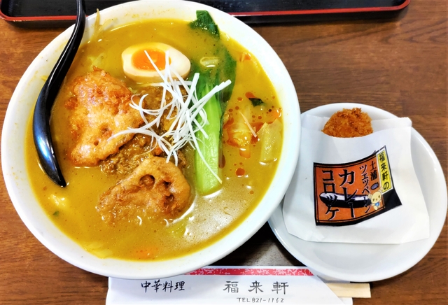 【レンコンカレーラーメン】 土浦はレンコンとカレーの街なので、レンコンカレーラーメンをいただきました。 (レンコンラーメンやレンコン味噌ラーメンもありました。) 麺は中細縮れ麵でカレースープはほどよいスパイシーさ。レンコンフライがおいしかったです。 ツェッペリンカレーコロッケも1ついただきましたが、カレーの具にもレンコンが使われていて、結構スパイシーでした。アツアツの揚げたてでこちらもおいしくいただきました。 レンコンカレーラーメン 800円、 ツェッペリンカレーコロッケ 170円。