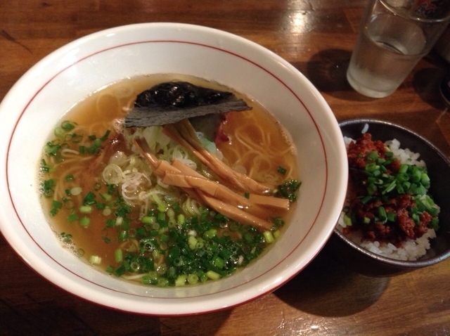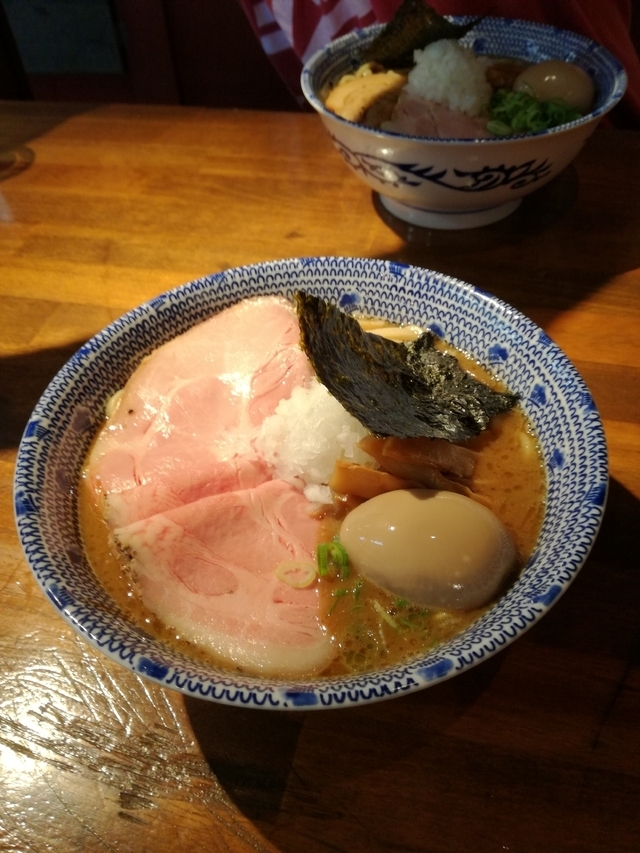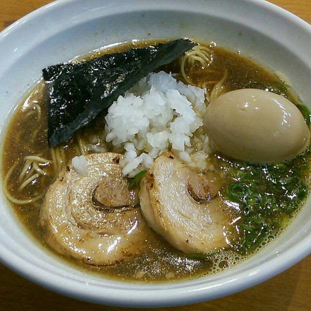 以前から気にはなっていた有名店ですが、駐車スペースが少なく激混み状態、あるいは休業が多いようなので、これまで訪れることがなかったのですが、出張帰りの夜に初めて立ち寄ることができました。それでも前客5人が店内の椅子で待つ満席という盛況で、外で1人待つ形となりました。とりあえず券売機で「鶏油塩」を選択し、ラーメンガイドクーポンの味玉を追加することに。20分程度待機でカウンターに着き食券を渡すと、スープには柚子が入るけれど大丈夫?と訊かれ、また叉焼は5種(バラ/炭火焼/直火焼/低温/ロース)の中から選ぶとのこと。上質な豚の外モモを低温調理し、モンゴルの岩塩と黒胡椒で味付けしたと能書きに書いてある低温叉焼を選びました。太麺なのでまた暫く待つとのことで、その間いろいろ眺めていると、店内に飲料自販機があることにも気づきました。前客がPETボトルのお茶を購入・ラーメンとともに口にしているのはちょっと珍しい光景。やがて鶏油塩と別皿の低温叉焼3枚が到来(スープがかなり熱々のため、レア状態の叉焼を直前まで保つための配慮なのかな?)。清湯的なあっさりした塩スープを想像していたので、茶色でどろっとし魚粉も感じられるスープはかなり意外。味付けは塩ダレでしょうが、醤油と言われてもちょっとわからないところ。また鶏油がスープ表面に厚く載っていて熱々。味わいは結構濃く感じたため完飲せず。具の低温叉焼は美味ですが、これの下味付けは薄め。他にメンマ、海苔1枚、刻み青ネギと白ネギ。食べ進める内に,確かに柚子皮の味わいもありました。当初抱いていたイメージと違ったので、別のメニューも試したいところです。