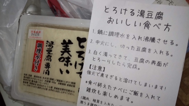 知人から珍しいとろける湯豆腐という名の豆腐を、いただきました。おいしい食べ方の紙が入ってたので、その通りに作ってみました。トロッとしたあつあつの湯豆腐を、スプーンですくってご飯の上にかけ、醤油を垂らしてた食べてみました。口の中でスルッと溶けて、今までの湯豆腐とは、違った美味しさでした。ごちそいさまでした。