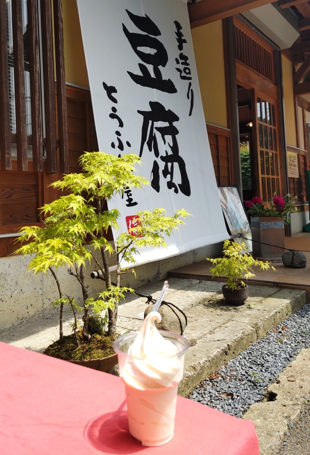 【豆乳ソフトクリーム】 国産大豆の豆乳を使ったソフトクリーム。 甘さ控えめなので、後味がスッキリとした感じです。 コーンとカップを選ぶことができ、1つ420円。