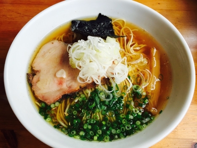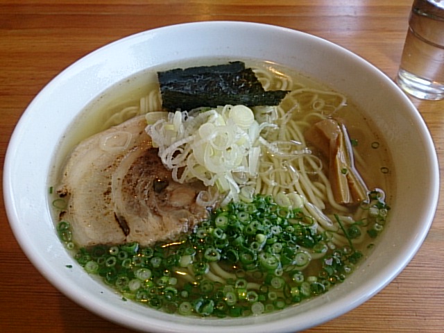 常に盛況な店なので、再び遅い昼に伺い何とか間に合いました。しかし目当ての鶏油はやはり完売だったので、今回は煮干蕎麦(塩)とRGクーポンのサービス叉焼を注文。叉焼は4種(炭焼き/バラ巻き/低温調理/直火焼き)から1枚はバラ焼きを選び、サービス分はお店任せ(低温、直火の2枚だった)。麺は細麺/中太麺から中太麺を。煮干粉が浮いて香りと味わいの強い清湯は、やや塩が強いかなとは感じましたが、とても美味しい。具は海苔1枚、メンマ、白ネギ、ワケギ、それに約6~8mmの分厚い叉焼。バラ巻きは脂が柔らかく美味しいし、低温はやはり生ハム様で歯ごたえと味わいが抜群。麺量も他所よりも多めなので満足でした。