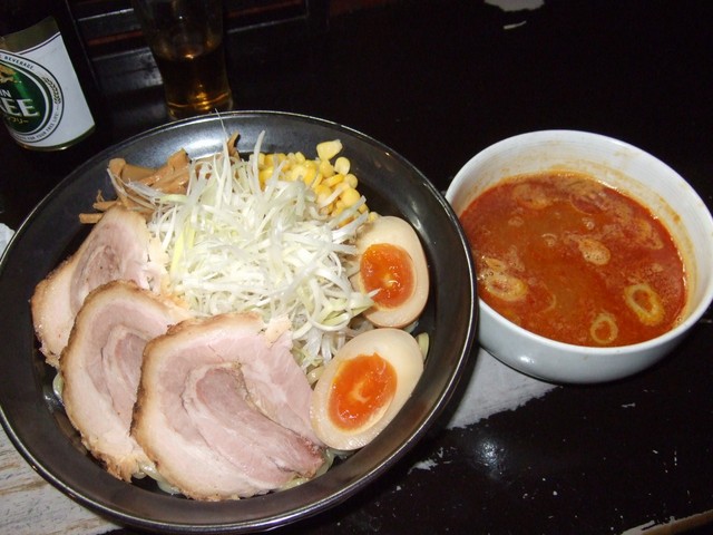 同店で最も好きなのは火山ラーメンですが 麺の太さは本店が好みなので、ここではつけ麺を 味噌味の全部乗せでオーダー。 噛み応えのある極太麺で、ガツンとパンチがある。 全部乗せと餃子も頼んだためお腹がいっぱいになり スープ割りいけなかったことがちょっと心残り~