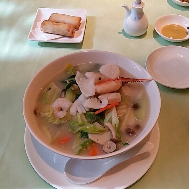 水戸市 ホテルのランチ 四川飯店 ●海の幸入りにぎやかスープそば1,650円 とにかく、海鮮が大量。 トッピングには、海老、かに、いか、 ホタテ、野菜など具だくさん。 味は野菜や、魚介の旨味がでた あっさり系で飲みやすい。 麺は細麺やわらかめ。 これに杏仁豆腐がつきます。