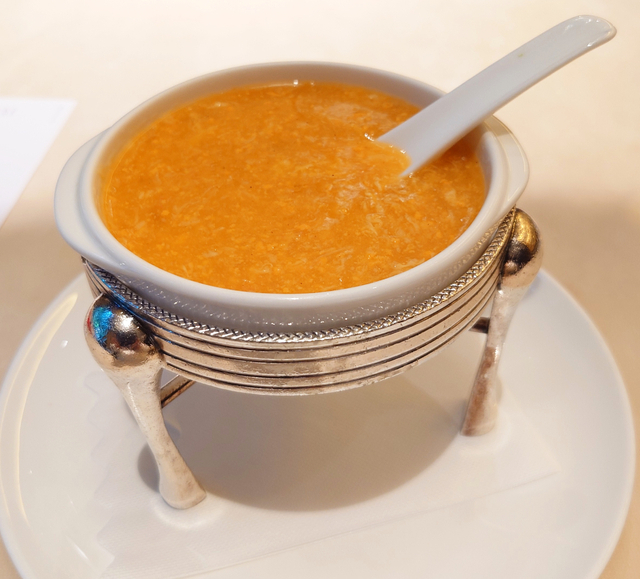 ホテルの高級中華とくれば不味いはずもないのですが、この店はそこいらの高級中華店と比較しても抜群に美味しいレストランです。そんな中で、私が最も好んで注文するのが、この『蟹卵入りふかひれの煮込み』。スープに分類される料理ですから決して腹にたまるものではないのですが、その濃厚かつ洗練された味わいは満足度が高いです。一人前1700円と決して安くはない値段ですが、それでも自分や家族の祝事の際などには必ず注文するようにしています。