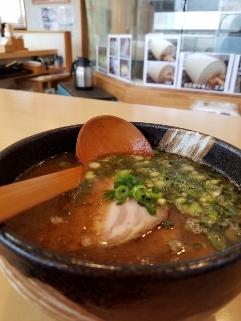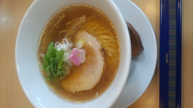 オシャレで明るい店内,多角形カウンターにソファーのような椅子。カウンターの中にはガラス張りの製麺室があるという変わった造り。「塩ラーメン」がウリで始まった店だが,つけ麺,醤油,味噌と,バリエーションを増やしている。自家製麺の旨味を一番味わえるのはつけ麺だが,一番好きなのは「男醤油900円」。鶏,豚,煮干しが効いていて,当たりは軟らかいのだがぐいぐい押してくる感じ。カエシは豊かな香り。砂糖ではない自然な大豆の甘み旨みが感じられる。チャーシューは2種。意図的に削ぎ切りにされていて厚い面は1㎝5㎜ほど。もう1種はバラの棒チャーシュー。こちらはスープの熱で脂が溶けるよう。口の中で適度に溶け,超旨い。