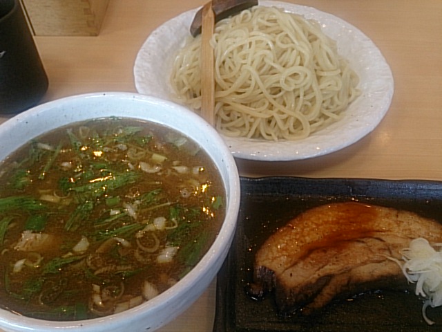 久しぶりに夕方に再訪し、今回は特徴的なネーミングの「男醤油」とクーポンでいつもの炙り叉焼を食しました。男醤油は醤油ダレに節・魚介系の出汁を合わせ、やや辛味も利かせているようで美味。つくばブランドの秀麗豚の肩ロースを用いたという分厚いぶつ切り叉焼とバラ肉叉焼が目立ち、分厚いのに歯応えは殆ど無いほど柔らかいのも特徴。その他の具は刻みネギに水菜のみとシンプル。やや高めの価格なのはやはりブランド豚使用ゆえですかね。別皿の厚さ約1cmの豚バラを用いた炙り叉焼(刻みネギ添え)は逆に歯応えがありますが、相変わらず美味しかったです。今回はちょっと肉三昧の感がありました。