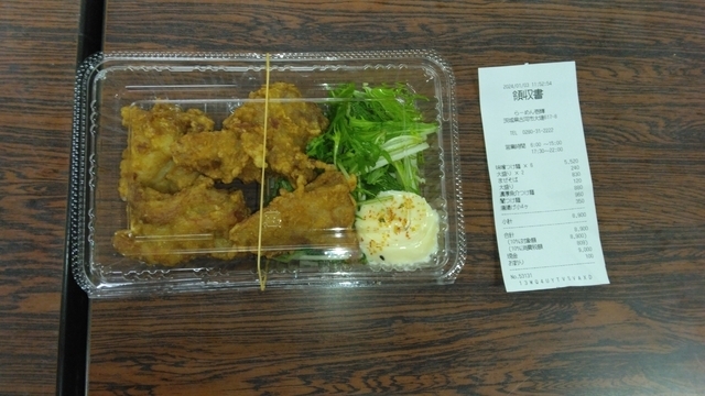 1/3にすでに営業していました。 テイクアウトでから揚げ4個350円をオーダー。 から揚げは大きすぎず、水菜とマヨネーズが添えられつまみにも、おかずにもちょうどいい量です。
