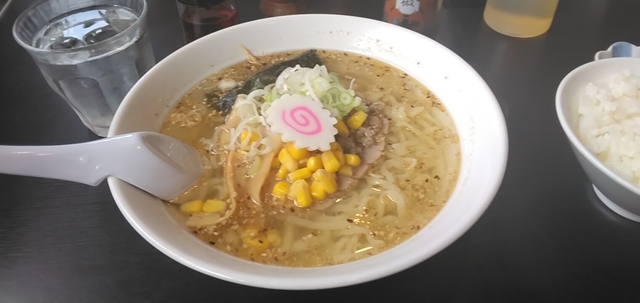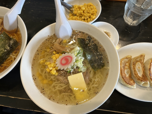 日曜夜にまた久しぶりに再訪。卓子席や小上がり席は満席で、カウンター席のみが空く盛況さです。カウンターの隣席間には仕切り設置の対策もされていました。今回は未食の味噌ラーメンと焼餃子(5粒)を注文。味噌ラーメンは白味噌仕立てなのかあまり赤くない味噌スープに、自家製の不揃いツルツル縮れ麺が浸っています。スープはマイルドな甘さがあって美味しい。具は約3~4mm厚の豚ロース叉焼1枚に角切り叉焼数個、炒めた豚挽肉、板海苔1枚、ナルト1枚、メンマ、刻み白ネギにコーン。白黒ゴマが結構浮いています。焼餃子も自家製のようでやや大きめ。餡肉に黒胡椒が練り込んであるのか、独特の刺激のあるのが特徴的。いずれも価格的に廉価な設定であるのも良いです。