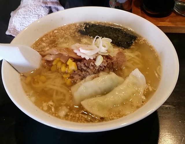麺は自家製麺の平うちちじれ麺で、やわらかめ。 スープは、鶏ベースの、ゴマ入りで、これは美味しい。 トッピングに、水餃子、チャーシュー、挽肉、コーン、海苔、ネギなど。 水餃子は、厚めの皮で、もちもちの野菜餃子。 味もいいが、値段が安く、これが650円なら大満足です。