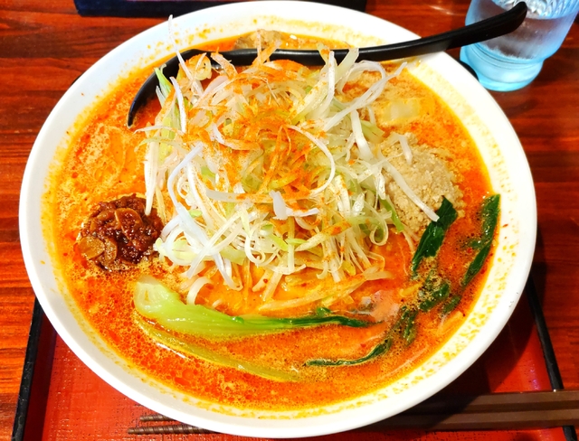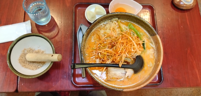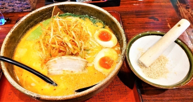 【煮たまごげんきらーめん】1000円 げんきラーメンをオーダーすると、ゴマをすりすりしてラーメンを待ちます。 ラーメンが来るとすりつぶしたゴマをかけていただきます。 ゴマ味噌のスープですが、よりゴマの風味を感じることができます。 煮たまごは奥久慈卵を使っています。やや塩味が強いです。 麺は太麺で食べ応えがあり、ピリ辛スープもおいしく、満足の一杯でした。