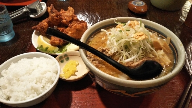 また、来ましたよ~ 今日は嫁さんが飲みたいというので私は食べに走ります。 いつものにんにく暴れらーめんにからあげのセット。 にんにくクラッシャーで入れるにんにくが小さくなってました、たまたま??