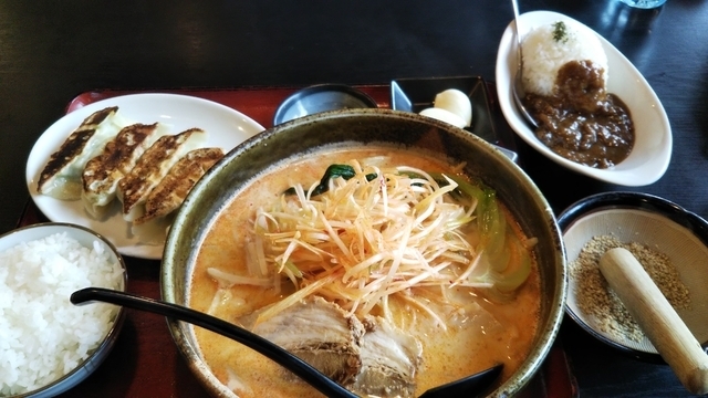 今日は嫁と二人で来ました。 げんきラーメンにニンニクトッピング。 ギョウザセットに一口カレーです。 この一口カレー味濃い目ですが美味しい。しかも100円です。