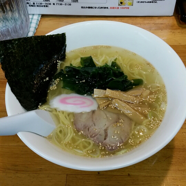 ●らーめんセット780円 塩らーめん細麺。 麺は、自家製玉子麺。 ベーシックな細麺ストレート。 つるつるして、美味しい麺。 スープは、塩ベースに、 胡麻が入り、飲みやすい味。 トッピングには、 大きなチャーシュー、メンマ、 刻みネギ、のりなど。 半チャーハン 以外とボリュームのある。