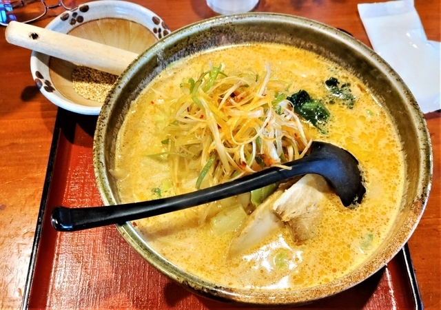 【激辛らーめん・中辛】 辛い信州熟成ゴマ味噌スープに縮れた太麺。そのままのスープでも結構辛さがありますが、そこにピリ辛玉がトッピングされ、さらに辛さがUP。辛いスープが絡んだ太麺はおいしく、野菜もたっぷりで食べ応えがあります。辛さは、中辛・爆激辛・超爆激辛の3段階から選べます。(1,100円)