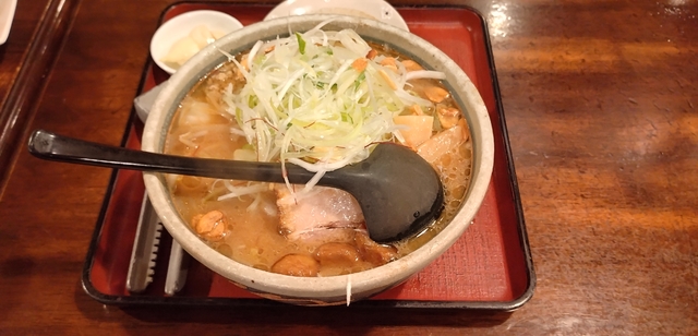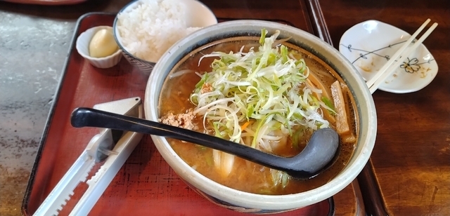 【ネギみそらーめん】 信州熟味噌を使ったみそらーめんは4種類ありました。 その中で、辛味ネギがのったネギみそらーめんをいただきました。 辛味ネギがのっていても、スープの辛さが物足りないので、唐辛子を振りかけました。 麺は太麺で、もやしやキャベツなど野菜たっぷりのらーめんで、おいしくいただきました。 (980円)