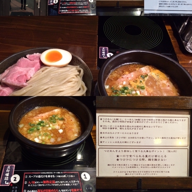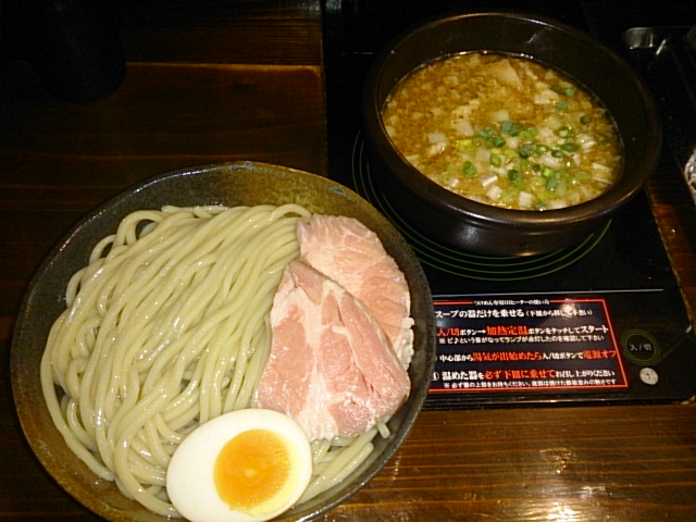 昼ちょっと前(11:45くらい)に入店。15分くらい待って席に座ることができました。 ラーメンガイドのクーポンで「炙りチャーシュー」をトッピングした つけめん( 醤油)をいただきました。 麺を待つ間に、つけ汁をあたためるIHヒーターが各席に設置してあり、熱・熱のつけ汁で、最後まで美味しくいただきました。 お店を出る頃には、店外に行列が出来ていました。