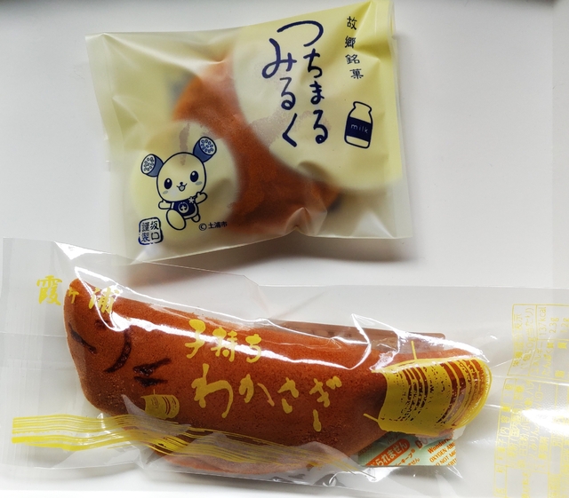 「つちまるみるく」と「霞ヶ浦子持ちわかさぎ」という二つのお菓子をいただきました。 つちまるとは、パッケージにある土浦市の公式キャラクターのことです。 つちまるみるくは、練乳を練り込んだ餡をバター風味の生地で包んだ焼菓子です。 子持ちわかさぎの中には、小豆が3,4粒入った求肥がたっぷり入っていました。 どちらのお菓子も土浦の銘菓のようです。