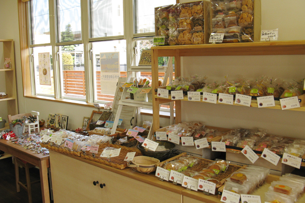 ナチュラルテイストな建物とマッチした、かわいい焼き菓子・雑貨がたくさん並んでます。