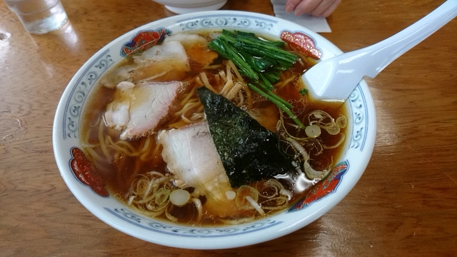 2018.8.29(水)12:35訪問。 座敷は満席。カウンターはいくつか空きが有り。 この日は所用で守谷市へ。 用件先からほど近いこちらでランチ。 大ラーメンをオーダーし、待つこと約10分、着丼。 まずはスープ。 しょうゆが強めだが、あっさりしていて旨い。 具は小さめのチャーシュー4枚に細目のメンマ、ノリ1枚、ホウレン草、ナルト。 チャーシューはモモ肉で、いわゆる「トロトロ系」ではないものの、ジューシーで旨い。 麺は中太。 ツルツルで旨い。 ごちそうさまでした。 次はチャーシューメンだな。