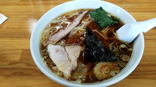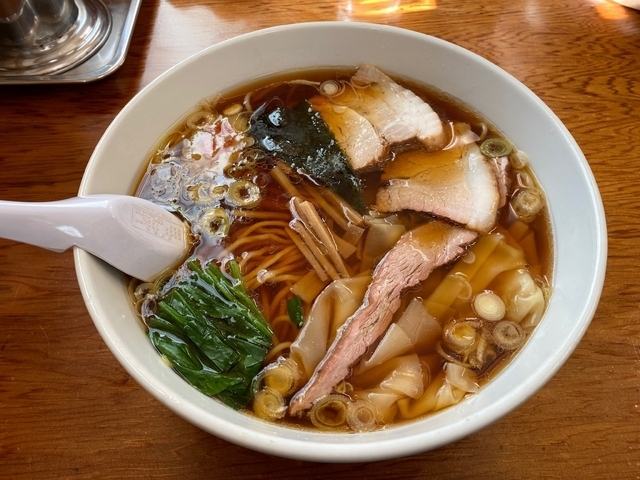 休日昼に初訪問です。カウンター・小上がりともに9割方が埋まる盛況さで、しかも地元のご家族さんが中心と見られ、地元に愛されている名店のようです。壁にかかるメニュー表には多くの品数が並んでますが、よく見ると、スープの味(醤油・味噌・塩・塩バター)やチャーシュー・ワンタンの有無、ワンタンの場合では麺の有無、盛りの違い(並盛・大盛・特大盛)等、これらの組み合わせで、一見、品数の多いことがわかりました。ワンチャー(醤油のワンタンチャーシュー麺)を注文。麺は自家製麺だそうで170g、やわやわでした。醤油スープは鶏ガラと鶏油で旨味が良くあっさりしてますが、ややしょっぱさを感じました。これは5枚入っている豚チャーシューが燻製後にしっかり醤油ダレで下味を付けられてるためでしょうか。その他の具は白河から取り寄せているという、つるつるのワンタン皮5枚、三角に切られた海苔1枚、ナルト1枚、ホウレンソウにネギ。昔懐かしいラーメンという趣でした。次は塩や塩バターあたりを試したいです。