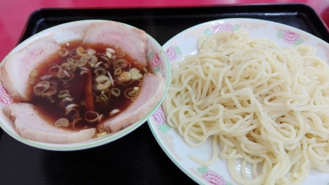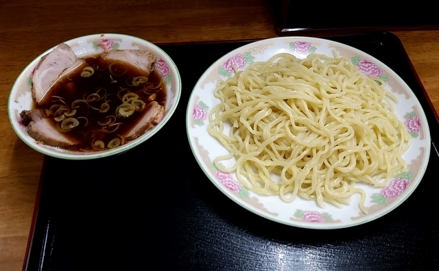 久しぶりに日曜午後に再訪すると、人気店だけに相変わらず盛況で、小上がりの卓子席に先客と相席で着きました。今回はこのお店の売りである、つけ麺(ワカメ入り)を注文。やがて熱々のつけ汁と浅皿に盛られた太麺が到来しました。つけ汁は一味が振られたピリ辛で、甘酸っぱいあっさり醤油スープです。たっぷりのワカメと短冊状に刻んだ豚ロース叉焼、刻みナルト、メンマ、刻みネギが具として入っています。浅皿の太麺は冷やしでなくやや温かみのある仕上がりで、つるつるもちもち感があります。麺をスープにつけて食すと、なんとなく昔懐かしい感じ。あっと言う間に完食完飲でした。