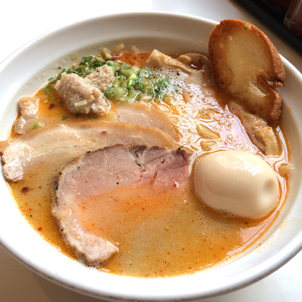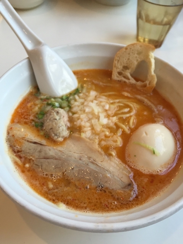 夜行くとスープ切れで閉店してしまっていることもあるくらい人気なお店。 ラーメン雑誌でも1位になっているし、実際並ばないと食べれない。 ラーメンのトッピングにフランスパンがついていて個性的だし、味もおいしい。