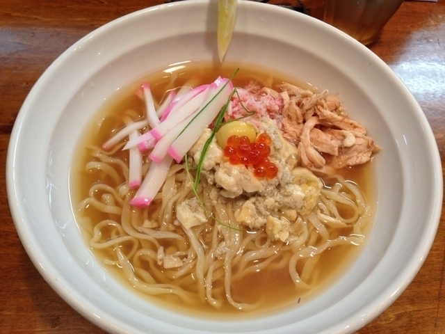 2015年7月18日 昼頃 この夏、第3段限定冷やしメニューの提供を聞きつけ、開店前並びで待ち。 店主に挨拶後、「冷製蟹茶碗蒸しラーメン」を注文し、着丼。 鮮魚スープにアサリの出し汁を合わせたスープとのことで、期待しスープをいただきました、、、旨い!!!トッピングの蟹味噌と貝柱の茶碗蒸し、ズワイガニのほぐし身、かまぼこ、いくら、銀杏、芋ねぎ、とりむね肉ゆずこしょう合えという豪華具材に店主の創造力に脱帽です。どれも相性よく美味しいです。 本当こちらの限定メニューには目を離せませんね!ご馳走様でした。