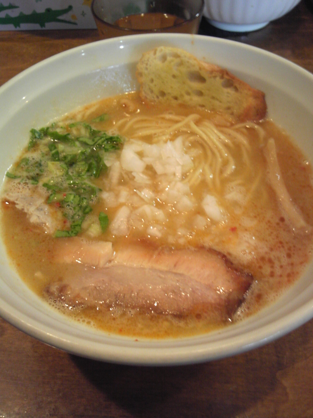 つくばで現在1,2位の人気を誇る店だけに、不便な立地にも関わらず、平日昼1時過ぎでも行列。鶏そば塩に味玉トッピングを注文。人気に違わず、濃厚な鶏塩スープは実に美味しい。スープ表面がオレンジがかっているのはドライトマトオイルとか。具としてガーリックトースト1枚が付いてるのが特徴的で、その他、豚叉焼1枚、鶏つくね1個、メンマ、刻みタマネギ、ネギ代わりのような刻み青菜。追加の味玉1個もいい味です。