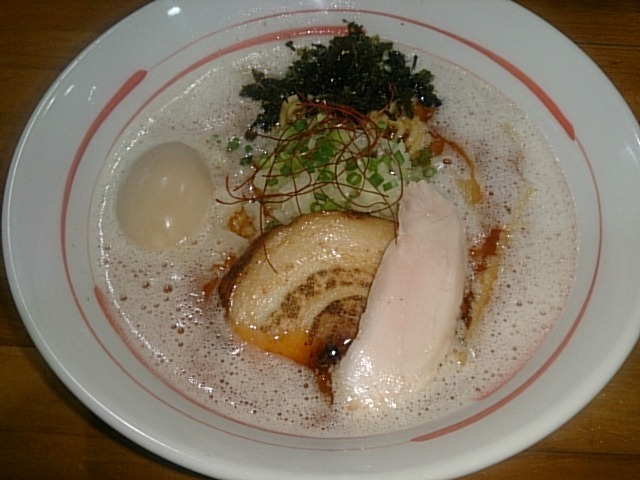 注文したのは、新メニューの ●味玉濃厚鶏そば 860円 スープの見た目は濃厚だが以外とあっさりして、鶏が強め目に出ている。 麺は中太麺160gで適量。あいかわらずもちもちで美味しい麺です。 豚チャーシューは分厚く焦げ目が入る。 鶏チャーシューはあっさり。 味玉は濃厚でとろとろ。 すべてがベストマッチです。