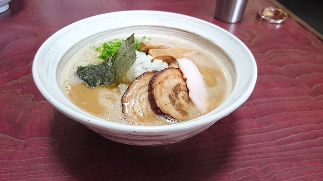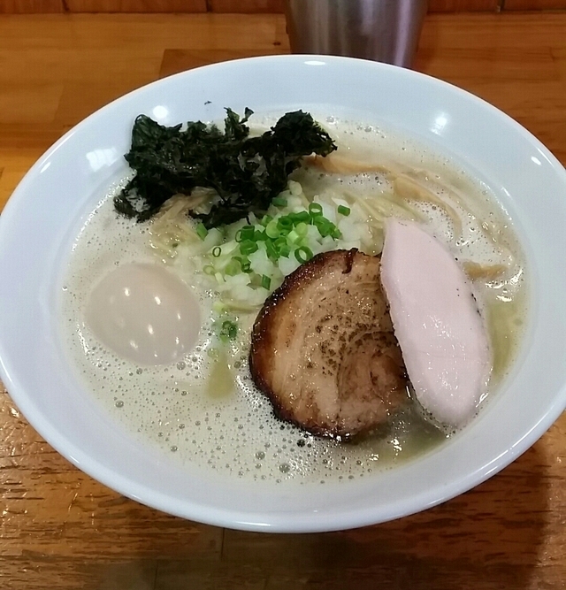 ●味玉むじゃきそば 880円 スープは鶏白湯ベースだが、魚介が強めで濃厚。 麺は中太麺160g 自家製麺でもちもち。 炙り豚・あっさり鶏チャーシュー・味玉・ネギ・メンマ・のりがトッピング。 期待を裏切らない、絶品らーめんです。