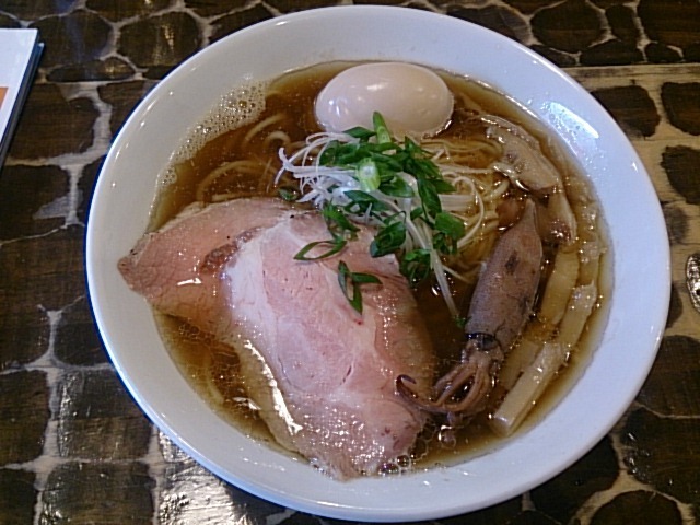 人気店ゆえ敷居は高いですが、今回、昼終了間際の14:30近くになんとか入店。それでも満席でしばらく待ち。つけ麺で有名ですが、汁そばのとんこつ醤油と龍神ぎょうざ(5個)を注文。普通盛(200g)も大盛(350g)も同額なので、迷わず大盛。極太麺ゆえ茹でが長引くので、先に龍神ぎょうざを味わいます。ネットリした食感の餡は特製タレで味付けされてるので、酢醤油無しで十分美味しいです。ようやく来たとんこつ醤油は、ドロッとしたスープで、豚骨よりも魚粉の香りと味わいが勝っています。麺はもちもちで美味しい。具は約7,8mm厚の叉焼1枚、海苔1枚、メンマ、小松菜、刻みネギ。次は手もみ中華そばを試したいです。