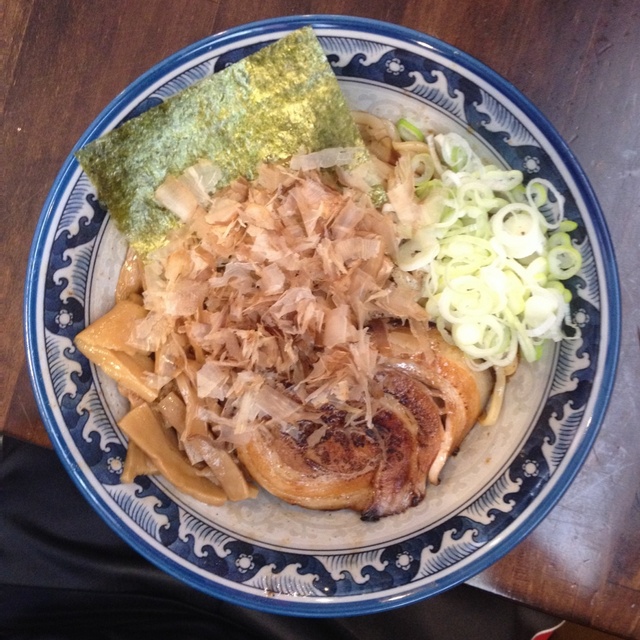 浜屋さんには何度も訪問しているのですが、いつもらーめんかつけ麺だったので、今回は、汁なしに初挑戦しました。 並だと足りなさそうなので、中盛+30円。 中待ちしていると、中盛は不可とのことで、並にするか大盛を選択しなければならず、大盛に••• 着丼した注文品は、鰹節が沢山載っており、あと、メンマ、チャーシュー、ネギ、海苔。 混ぜていただくと、味は濃い目で、黒胡椒が効いています。 麺は茹で加減も丁度良いものでした。 大盛にしたせいか、後半は少し飽きた感がありましたが、完食。 ご馳走さまでした。