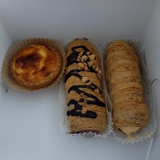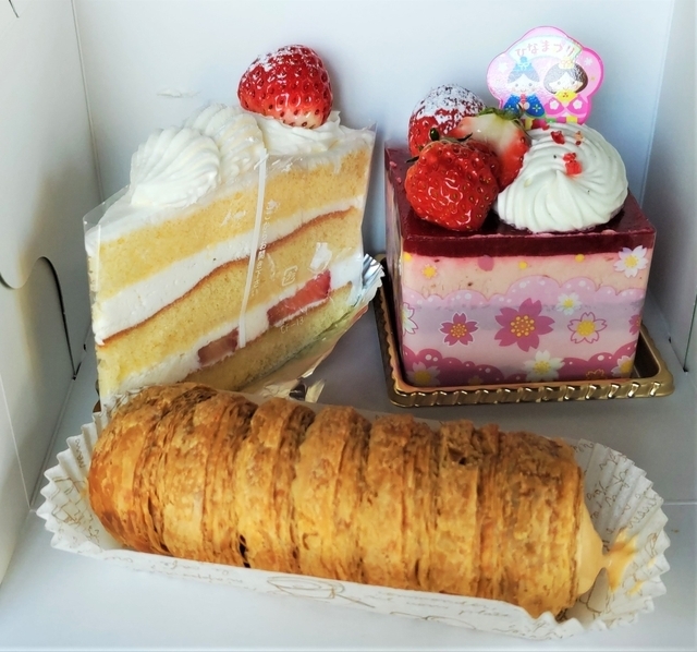 【焼きたてコルネ】 人気No.1と聞き購入しました。サクサクした筒状の生地の中に、カスタードクリームが詰まっていて、とてもおいしいです。1本だけじゃ物足りない感じです。(1本295円) その他にショートケーキ(470円)とひなケーキ(600円)を購入しました。シンプルなショートケーキでしたが、生クリームがおいしかったです。
