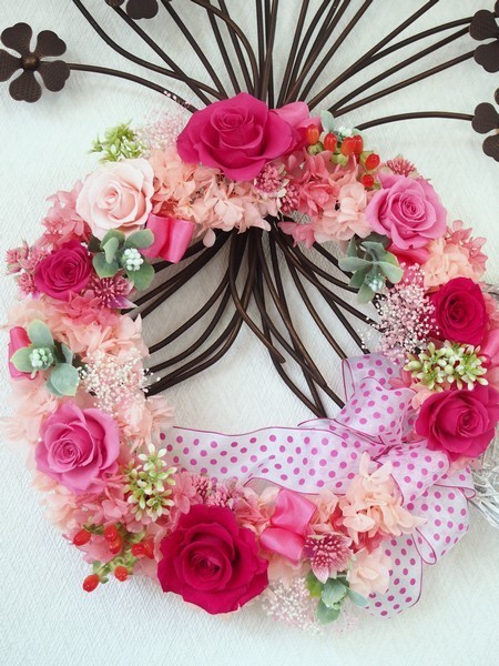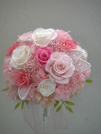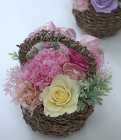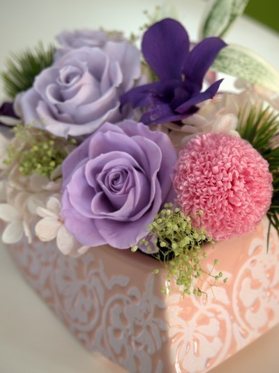 Preserved(プリザーブド)とは、「保存する」という意味で、「プリザーブドフラワー」は、生花や葉を特殊液の中に沈めて、水分を抜いた素材のことです。花の組織を保ちながら脱水。そこに着色料を混ぜた特殊溶液を浸透させ、さらに排水・乾燥の段階を経て加工します。 生花の風合いや手触りを長期間失わないようににした“新しい花”です。従来のドライフラワーとはまるで違う花材として注目を集めています。