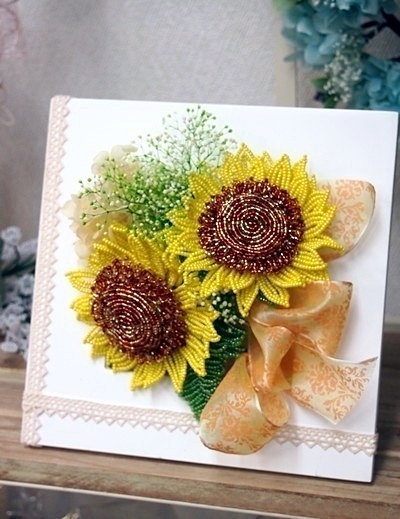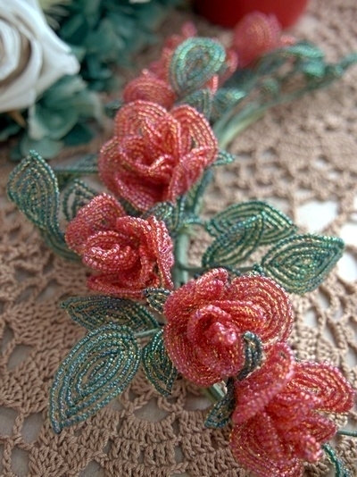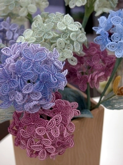 約2ミリのガラスビーズを専用のカラーワイヤーに通し、花びらや葉、それぞれのパーツを作り実物大の花に仕立てていくガラスのお花です。