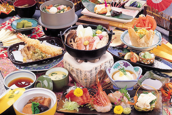 食事は地場産物の奥久慈シャモ、常陸牛、鮎、湯葉や刺身コンニャクを使った郷土料理が自慢です。