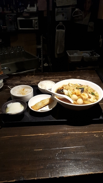 ランパラ再チャレで伺いましたが、またしても売切れだったので、通常ランチの「担々麺定食」を食しました。担々麺にミニライス、サラダ小鉢(ダイコンとニンジンの千切り)、漬物(胡瓜漬、福神漬)、杏仁豆腐小鉢、ドリンク(9種からジンジャエールを選択)が付いてます。しかしながらメインの担々麺は、そぼろ肉が載っているものの、全く辛くなく、芝麻醤や辣油は使用していない模様。また、もやし・ニラ・ニンジン炒めの餡かけがかかっているのも目新しいというか・・。担々麺としてでなく、ゴマ入りの普通の味噌ラーメンとしてはそれなりに美味しいですが、よくある担々麺を求めるなら残念。ミニライスをお替わりして量的には満足でした。