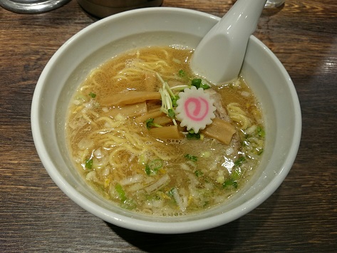 JR水戸駅ビル内にあるつけ麺の有名店で、水戸での仕事が終わった夕方に立ち寄りました。夕食にはやや早い時間帯ですが、既に行列が出来ていて人気のほどがわかります。つけ麺よりはラーメン派なので、券売機で「中華そば」を選択。店内は若い男女カップル率が高いです。カウンターに着くと、既に小皿に載った金属製レンゲが目の前に置かれてますが、これはどうやらつけ麺用らしい。店内の能書きによると、ここの中華そばは、数種の煮干と鯖節・宗田節を多量に使って出汁を取ったそばとのこと。目的の品が到来したところで、まずスープを味わうと、煮干や各種節の味わいが強く実に美味しい。ただタレを多くしているのか味付けが濃いです。具は7-8mm厚の豚チャーシュー1枚、ナルト1枚、メンマ、カイワレに刻みネギ。食べ進めると刻み柚子皮も入っていることに気づきました。カウンター常備のフライドオニオンを追加してさらに美味しくして完食でした。
