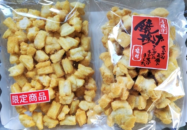 今回購入したのは『鏡揚げ(塩)』と限定商品の『いか揚』。 鏡揚げの塩は、看板商品で、文句なしのNo.1。(200g 378円) 限定商品は、材料にいかパウダーを使用していますが、あまり感じられません。 でも、おいしいです。(110g 368円) かりんとうまんじゅうの『水戸饅』はすでに売り切れで購入できませんでした。 やはり、早い時間の訪問が必須ですね。