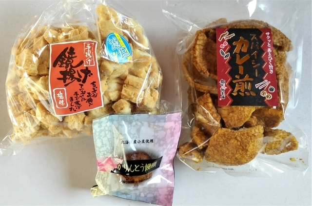 今回3つの商品を購入しました。 【鏡揚げ塩味(減塩)】50%塩分をカットした新商品。(598円) 【スパイシーカレー揚げ煎】カレーの味がしっかりと付いたやや堅めの煎餅。(324円) 【水戸饅】カリッとしたかりんとう饅頭で、個人的に鏡揚げと並ぶイチオシの商品。(118円) 本当においしくて、手が止まらなくなります。
