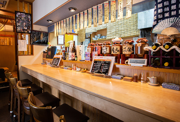 店内は、掘りごたつ風のお座敷席と、ひとりでもゆっくり過ごせるカウンター席とがございます。