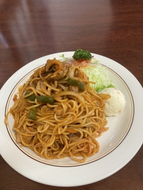 ミートナポリ。豚肉が沢山のナポリ。丸い皿に山のようなナポリタン…豚肉が沢山入ってます。キャベツとポテトサラダも少々。お腹いっぱい。