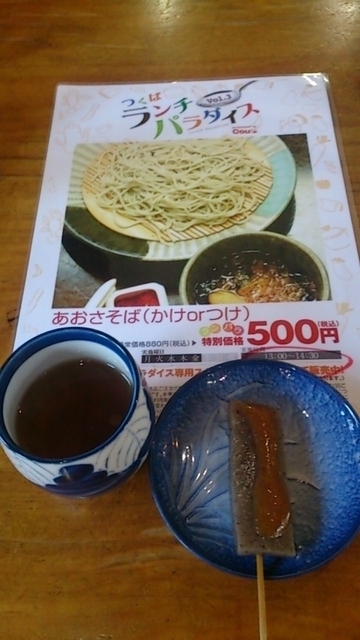 ランパラメニューのあおさそば(冷やしつけ)を注文。突き出しに味噌田楽(こんにゃく)1串が出て、麦茶(追加は卓子上のポットから注ぐ)とともにいただく。柚子甘味噌の香りが良いです。しばらくして配膳されたあおさそば、常陸秋そばの十割とのことなので、そうは食す機会がないだけに貴重かも。そばの香りが良いです。つけ汁にはアオサ、揚げ玉、甘く煮た油揚げ1枚が浸されていて、アオサの香りがまた良い。これに薬味のネギ/ワサビ。鰹の香りを感じるつけ汁で一気にそばを完食。〆のそば湯もそこそことろみのあるやや白濁した湯で、つけ汁も完食でした。