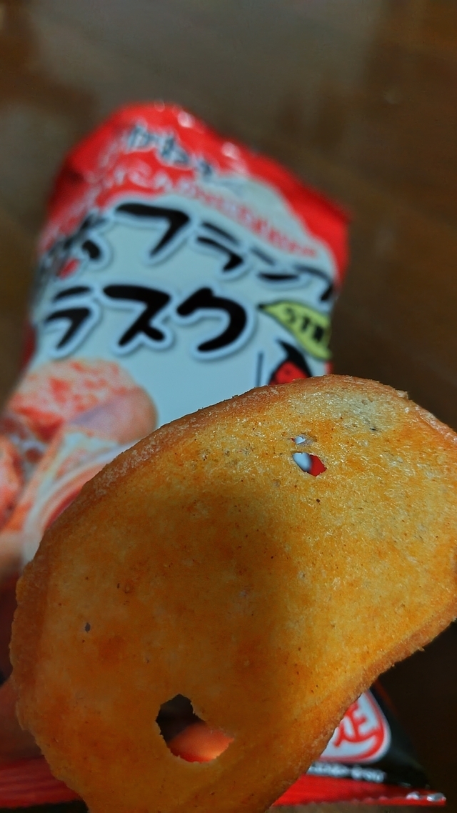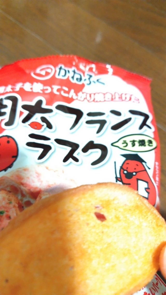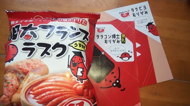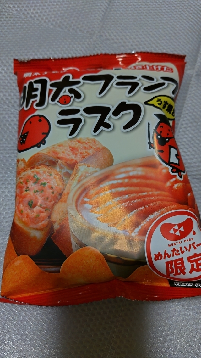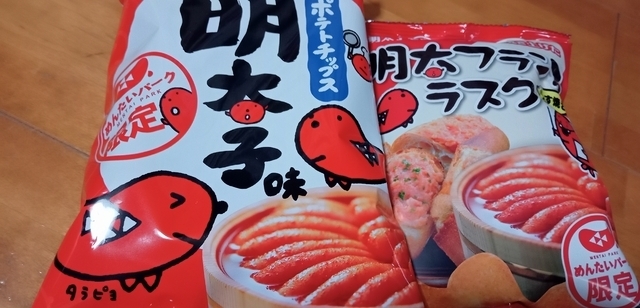 めんたいパーク限定の「ポテトチップス明太子味」「明太フランスラスク」を家族が福引でもらってきてくれました。ポテトチップスは、初めて食べました。ピリ辛でとても美味しかったです。